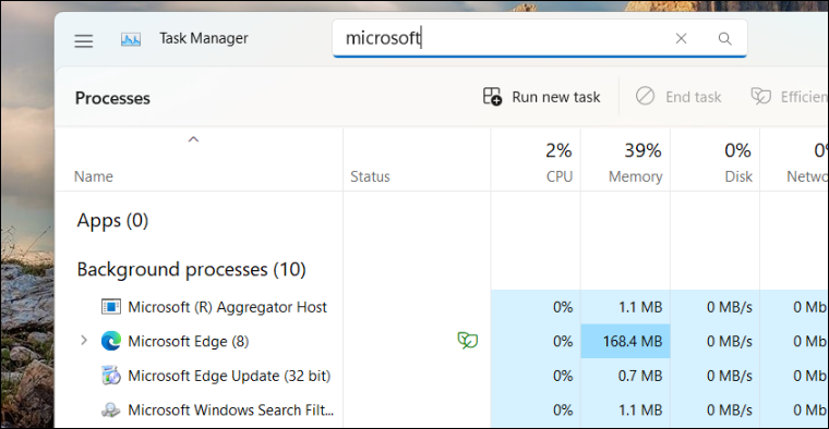 أداة مدير المهام (Task Manager) في ويندوز 11 حصلت على تغييرات جذرية خلال تحديثات 2022 أهمها إعادة التصميم الشاملة تقريبًا لواجهة المستخدم لتكون أكثر تناسقًا مع تصميم ويندوز 11. ولكن لم تتوقف مايكروسوفت عن تعزيز الأداة بإضافات جديدة، من بينها ميزة Filter processes التي ظهرت في النُسخة التجريبية. هذه الميزة تتيح للمُستخدمين فلترة جميع المهام والعمليات المعروضة للعثور بسهولة على تلك التي تحمل اسم معين أو التابعة لبرنامج محدد، فمن خلال شريط بحث يظهر في الجزء العلوي للنافذة يمكن كتابة الحروف الأولى من اسم البرنامج أو العملية ليتم فورًا عرض المهام المتطابقة، سواء كان ذلك في قسم Processes أو Details أو غيرها من الأقسام الأخرى داخل الأداة. هذه الميزة مفيدة إذا كنت تريد مراقبة أداء عملية أو مجموعة من العمليات بعينها وترغب في اتخاذ الإجراء المناسب تجاهها بسهولة.