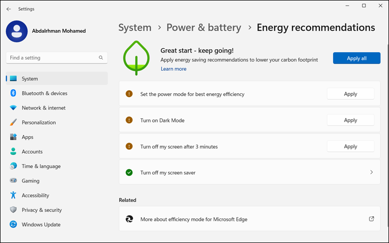 يمكن تفعيل كلًا من هذه التوصيات فرديًا أو الضغط على “Apply all” لتطبيقهم دفعة واحدة، وبعدها تُصبح أيقونة “ورقة الشجر” خضراء بالكامل. هذه الميزة مفيدة في بعض المواقف، خصوصًا إذا كانت بطارية اللابتوب لا تصمد فترة طويلة، فربما هذه التوصيات تؤدي إلى إطالة عمر البطارية لاستخدام اللابتوب فترة أطول قبل توصيله بالشاحن. ومن المتوقع أن يتم طرح الميزة قريبًا لجميع مستخدمي ويندوز 11.