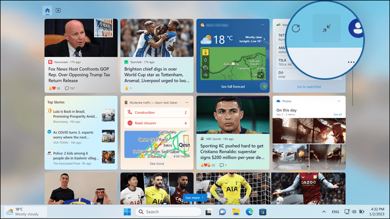 يبدو أن مايكروسوفت مازالت تراهن على ميزة Widgets في ويندوز 11 باعتبارها وسيلة سريعة لمعرفة آخر الأخبار المحلية والعالمية وأيضًا متابعة حالة الطقس والأنشطة المالية حسب اهتمامك. من حين لآخر يتم إضافة خواص جديدة للـ Widgets مثل إتاحة عرض معلومات من تطبيقات مُعينة وأيضًا إمكانية تعديل الواجهة وترتيب الأولويات…إلخ، ومن بين الإضافات الجديدة للميزة هي “العرض الموسع” Expanded View وهو وضع يمكن تفعيله بالضغط على الزر الموجود بجوار صورة الحساب في الزاوية اليمنى العليا. بمجرد تفعيله يتم عرض الـ Widgets على مساحة أكبر تشغل الشاشة بالكامل تقريبًا، وبالتالي يستطيع المستخدم أن يرى مزيد من المحتوى أمامه بمجرد الضغط على الزر المخصص للميزة على شريط المهام.