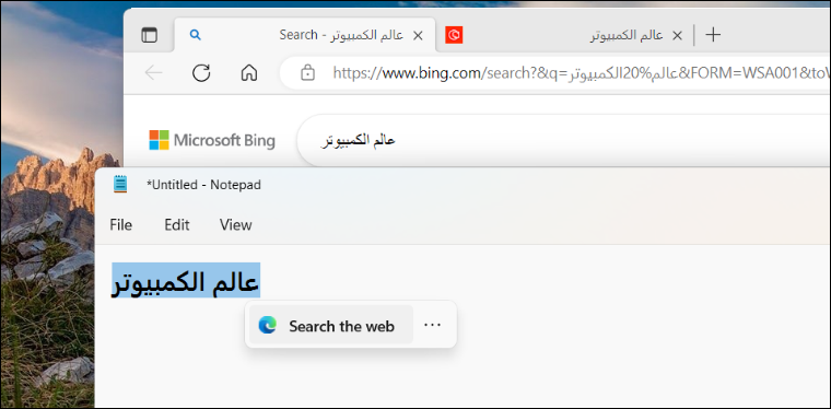 طرحت مايكروسوفت بالفعل خاصية “Suggested Action” في ويندوز 11 ضمن تحديث 22H2 العام الماضي، والتي تقوم باقتراح إجراءات معينة حسب النص الذي تقوم بنسخه، فمثلًا عند نسخ تاريخ يتم اقتراح تسجيله في تطبيق “التقويم” أو عند نسخ رقم هاتف يتم اقتراح الاتصال به باستخدام تطبيق Phone Link وهكذا. حاليًا تختبر مايكروسوفت عددًا من الإجراءات الأخرى التي ستقوم الخاصية بعرضها بعد التحديثات القادمة لويندوز 11 ومن ضمنها اقتراح البحث على الإنترنت. عندما تقوم بنسخ أي كلمة أو عبارّة، بغض النظر عن البرنامج الموجودة فيه هذه الكلمة، سيظهر أمامك خيار “Search the web” والذي بدوره يبحث عن الكلمة على الانترنت باستخدام متصفح مايكروسوفت إيدج أو ايًا كان المتصفح الافتراضي الذي تستخدمه.