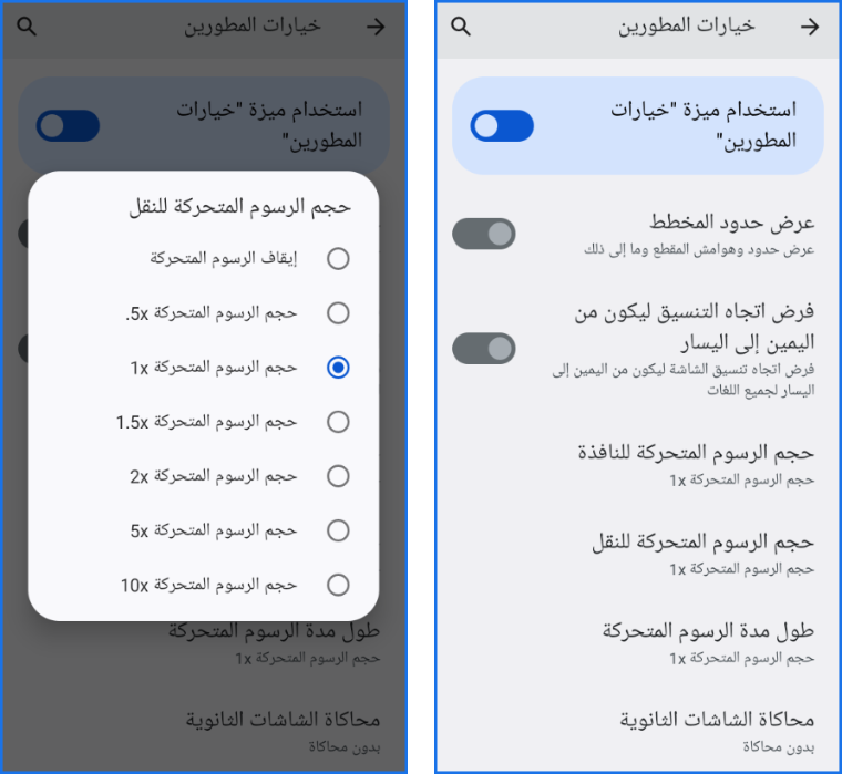 تُتيح قائمة خيارات المطوّر كذلك إمكانيّة التحكّم في سُرعة عرض الرسوم المُتحرّكة على الجهاز من خلال تغيير القيم المُحدّدة على ثلاثة مقاييس هما مقياس سُرعة عرض رسوم النوافذ “Window animation scale” ويتحكّم في سُرعة فتح وإغلاق التطبيقات. أيضًا مقياس سرعة الانتقال بين النوافذ “Transition animation scale” ويتحكّم في سُرعة التبديل بين التطبيقات المُختلفة. ثم هناك مقياس مُدّة عرض الرسوم المتحرّكة “Animator duration scale” ويتحكّم في عرض الرسوم المتحرّكة الصغيرة الموجودة داخل التطبيقات مثل رسوم الأزرار والقوائم.