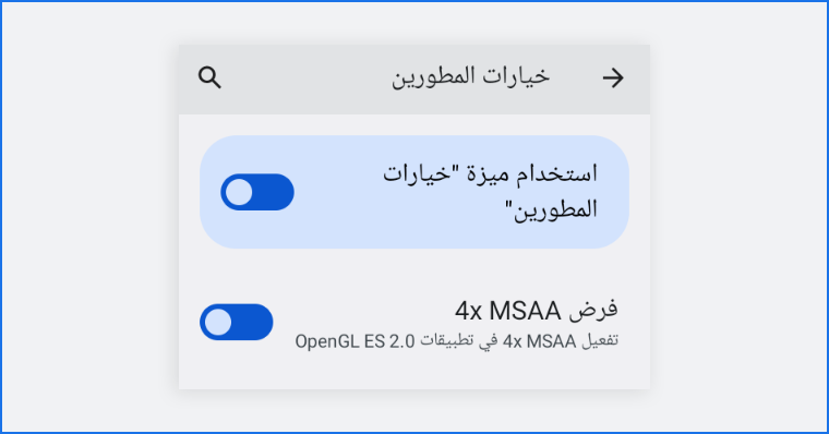 توفّر قائمة خيارات المطوّر كذلك مجموعة أدوات إضافيّة مُميّزة مُضمّنة بشكل خاص لمعالجة الرسومات المتقدّمة بحيث تسمح بالتحكّم في سُرعة الرسوم المُتحرّكة للألعاب لمنحها مزيد من الحيوية في الحركة. يُمكن تفعيل هذه المجموعة من الأدوات من خلال خيار “فرص 4x MSAA” الموجود ضمن قائمة خيارات المطوّر، وتساهم هذه المجموعة من الأدوات في تسريع الألعاب المُتطوّرة على الأندرويد ومنح المستخدم تجربة بصريّة أكثر سلاسة تظهر فيها الألعاب والتطبيقات المتطورة بمظهر أفضل. غير أنّها تتطلّب عادةً أن يكون الهاتف أو الجهاز اللوحي المُستخدم في الألعاب مزوّدًا بوحدة معالجة رسوم (GPU) مناسبة، وإلا فقد يتسبب تسريع الألعاب في حدوث مشكلات في أداء الجهاز، وقد يتسبّب في إيقاف تشغيله بالكامل.