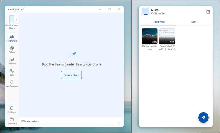 بعد الانتهاء من ربط الهاتف باللابتوب، تظهر واجهة المستخدم البسيطة لبرنامج Intel Unison حيث يتم عرض اسم الهاتف بالأعلى وبالضغط عليه تظهر نسبة البطارية وخيار “منع الإزعاج” Do not disturb الذي يعطل أي إشعارات أو مكالمات بشكل مؤقت، بالإضافة إلى خيار إلغاء الاتصال. ثم هناك الوظيفة الأولى في البرنامج “File Transfer” حيث يمكنك إرسال أي ملف على اللابتوب، أيًا كان حجمه، إلى الهاتف في لمح البصر! وهذه أهم ميزة في البرنامج كونه يعتمد على تقنية Wi-Fi Direct في الاتصال وتبادل البيانات.