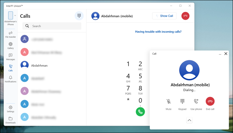 توجد أيضًا خاصية إجراء المكالمات الهاتفية الصوتية مباشرًة من الكمبيوتر، فعند الانتقال إلى قسم Calls يستعرض البرنامج قائمة جهات الاتصال الكاملة بهاتفك، يمكنك اختيار أي جهة اتصال والضغط على زر “Call” لبدء المكالمة، أو بدلًا من ذلك تستطيع إدخال الرقم يدويًا من لوحة الأرقام المعروضة على الجانب الأيمن. بمجرد أن تبدأ المكالمة، سواء صادرة أو واردة، ستظهر نافذة منبثقة جديدة تعرض عداد الدقائق وإمكانية تحويل المكالمة إلى الهاتف بدلًا من ميكروفون اللابتوب، وأيضًا خيار كتم الصوت وإظهار لوحة الأرقام، وبالتالي ربما لا تحتاج أصلًا إلى الهاتف للقيام بأي شيء آخر أثناء المكالمة.