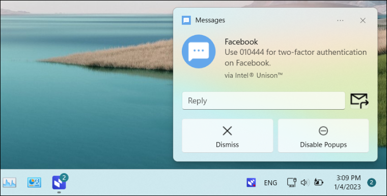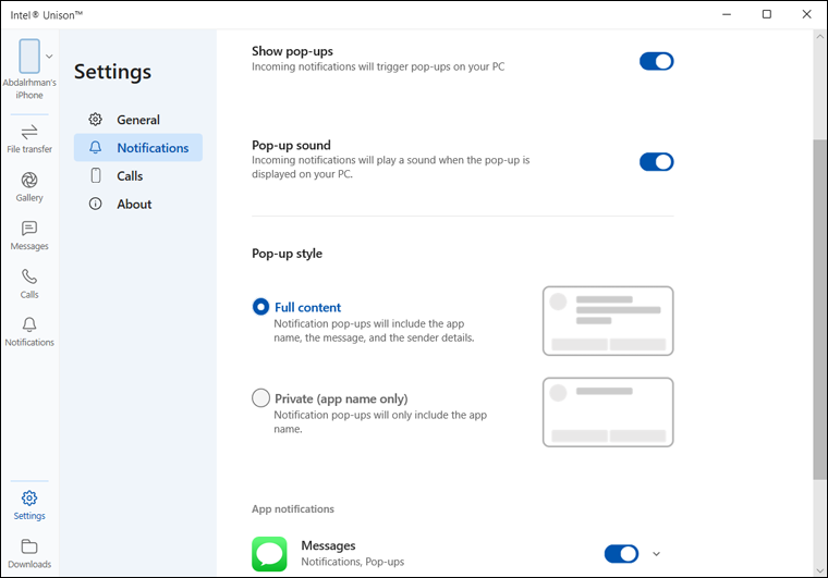أثناء عمل برنامج Intel Unison في الخلفية، ستظهر أي إشعارات جديدة واردة إلى هاتفك على الكمبيوتر، ولكن ضمن الإعدادات الخاصة به يمكن التحكم في ذلك مثل تعطيل الإشعارات نهائيًا أو جعلها تظهر بشكل يحافظ على الخصوصية بحيث لا يتم عرض محتوى الإشعار ويكتفي بذكر اسم التطبيق فقط، يمكن أيضًا تحديد التطبيقات التي يُسمح لها بإرسال إشعاراتها إلى اللابتوب.