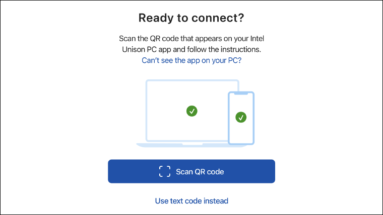 بعد تشغيل برنامج Intel Unison على الكمبيوتر لأول مرة، سيطلب منك تفعيل كلًا من اتصال الواي فاي والبلوتوث. بعد التأكد من ذلك سيظهر كود QR على الشاشة مع توضيح التعليمات المطلوبة لإتمام عملية ربط الهاتف بالجهاز. الآن انتقل إلى هاتفك الأندرويد أو الآيفون وقم بتشغيل تطبيق Unison وسيطلب منك أيضًا تفعيل البلوتوث في حال كان معطل، ثم بعدها تقوم بالموافقة على الصلاحيات المطلوبة للوصول إلى البيانات مثل الصور والاشعارات والرسائل وجهات الاتصال…إلخ. بعد الانتهاء اضغط على “Scan QR Code” وقم بتوجيه كاميرا الهاتف نحو الكود الظاهر على الشاشة لإتمام عملية الاتصال. وهنا يجدر بنا الإشارة إلى كون التطبيق يعتمد في الاتصال على تقنية Wi-Fi Direct بدلاً من أن تكون الأجهزة متصلة على نفس الشبكة، عكس معظم البرامج المماثلة بما فيهم Phone Link.
