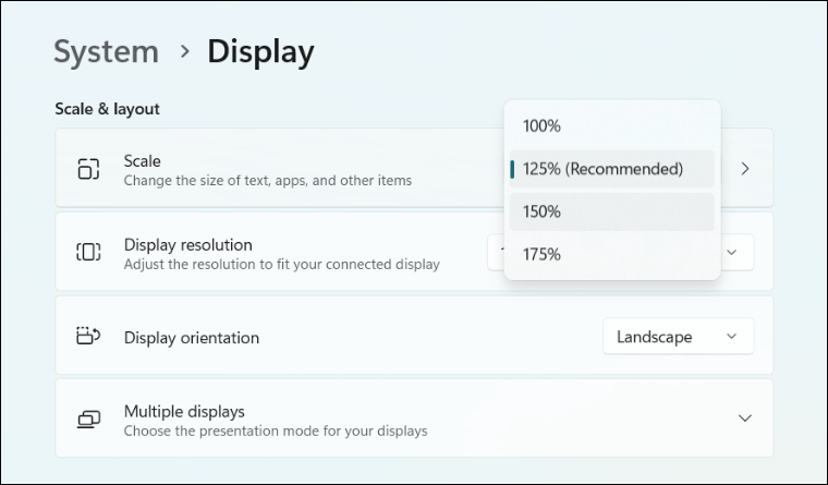 لحسن الحظ، يمكنك أيضًا حل هذه المشكلة عن طريق تكبير النص بشكل عام في كل عنصر في الويندوز أو البرامج، بما في ذلك تكبير الأيقونات وليس فقط النص. لفعل ذلك، قم بالتوجه إلى قسم System في تطبيق Settings ثم اضغط على “Display” في الجهة اليمنى، بعد ذلك أمام خيار “Scale” اضغط على القائمة ثم اختر نسبة زيادة حجم النص سواءً 25% أو 50% أو 75% أكبر من الحجم الحالي. بمجرد تحديد اختيار من القائمة، ستصبح التغييرات نافذة المفعول. ينبغي الآن أن ترى النص بوضوح في أي شيء يُعرض على الشاشة داخل نظام ويندوز، بما في ذلك التطبيقات والبرامج.