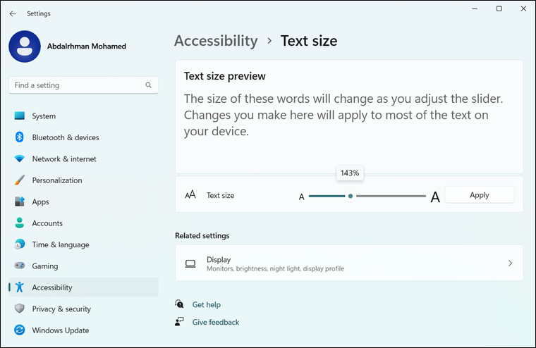 يمكنك سحب الدائرة الموجودة على شريط التمرير إلى اليمين لتكبير النص تدريجيًا، حيث من المفترض أن تظهر لك معاينة “Text size preview” تمنحك فكرة عمّا سيبدو عليه حجم النص عند هذا المستوى. عمومًا، قم بسحب الدائرة إلى أن تصل إلى المستوى المُناسب حيث يصبح نص المعاينة سهل القراءة بالنسبة لك. حينئذ قم بالضغط على زر “Apply” ليتم تطبيق التغييرات على الفور بزيادة حجم النص في الويندوز. لن تحتاج إلى إعادة تشغيل الجهاز أو تسجيل الخروج حتى.