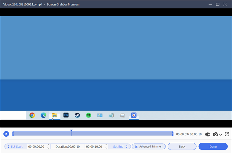 بعد الانتهاء من تسجيل الفيديو ستظهر على الفور نافذة المعاينة، حيث يمكنك مشاهدة التسجيل كاملًا مع إمكانية قص أجزاء منه اما بشكل سريع من الشريط الموجود بالأسفل أو اضغط على “Advanced Trimmer” للانتقال إلى أداة أخرى مضمنّة في البرنامج لقص مقاطع الفيديو بأسلوب أكثر دقة واحترافية. ولكن في حال كان الفيديو جيدًا ولا يحتاج تعديلات اضغط Done وسيتم حفظ المقطع مباشرًة على الجهاز في المجلد المحدد.