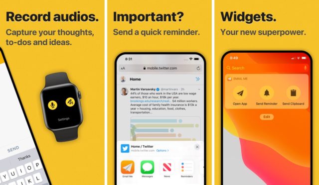 شخصياً حتى أتذكر أي شيء يجب أن أرسله لنفسي عبر البريد، ولكن الأمر يحتاج إلى أن أنسخ الشيء الذي أود أن أذكره ثم افتح تطبيق البريد ثم أقوم بلصقه وإرسال البريد لنفسي، هذا التطبيق يوفر العناء عبر وضع نفسه في قائمة المشاركة، وإذا أردت إرسال أي شيء لنفسه فقط شاركه عبر التطبيق وسوف يتم إرسال بريد لك بخطوة واحدة. أيضا التطبيق نفسه تطبيق ملاحظات لتسجيل الملاحظات المهمة بشكل سريع وتذكيرك بها بصورة عاجلة التطبيق يقدم واجهة نظيفة للكتابة و ويدجت أيضا التطبيق يدعم سيري فيمكنك فقط إخبار جهازك بما تريد منه أن يقوم بتسجيله وسيقوم بإرسال لبريدك.