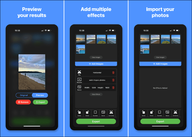 كما يوحي الاسم، يتيح لك هذا التطبيق إجراء مجموعة من التعديلات على عدة صور في وقت واحد بضغطة زر، وهو مجاني تمامًا. Bulk Image Editor يمكن تثبيته على الآيفون والآيباد وأجهزة macOS ويتميز بسهولة الاستخدام بفضل واجهته الرسومية المباشرة، إذ كل ما عليك هو إضافة جميع الصور المطلوب تعديلها من مكتبة الصور الخاصة بك أو من تطبيق Files، بعدها أضف التعديلات اللازمة، بما في ذلك تدوير الصور أو عكسها أو تغيير الأبعاد أو إضافة حدود داخلية أو إعادة تسمية الصور..والمزيد. للأسف لا يوفر التطبيق إمكانية إضافة تأثيرات أو فلاتر لونية لكن بدلًا من ذلك يركز على أدوات التعديل الرئيسية، وبضغطة واحدة على زر Export سيتم تطبيق التعديلات على جميع الصور وتصبح جاهزة للحفظ على ذاكرة هاتفك أو على iCloud Drive أو أي مجلد آخر تقوم باختياره من خلال تطبيق Files. [تحميل التطبيق: iOS]