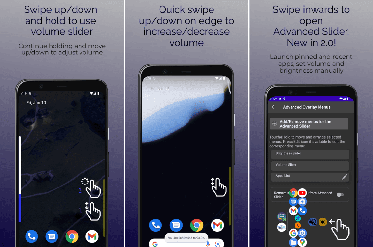 يتيح هذا التطبيق تنفيذ إجراءات معتادة مثل ضبط مستوى الصوت أو سطوع الشاشة وتشغيل/إيقاف الوسائط وغيرها عن طريق الإيماءات السريعة لتسهيل استخدام الهاتف بيد واحدة وتجنب الضغط على الأزرار الجانبية عندما توجد صعوبة في ذلك. بعد تثبيت Easy Slider سيظهر شريط شفاف على الحافة الجانبية للشاشة، بمجرد تمرير الإصبع فوقه ثم السحب نحو اليسار ستظهر قائمة تشمل عددًا من الإجراءات التي يمكنك تنفيذها بمجرد تثبيت اصبعك فوق ايًا منها، فعلاوًة على الإجراءات المذكورة يمكنك أيضًا فتح تطبيقات مختارة أو عرض التطبيقات المفتوحة مؤخرًا أو قفل الشاشة.