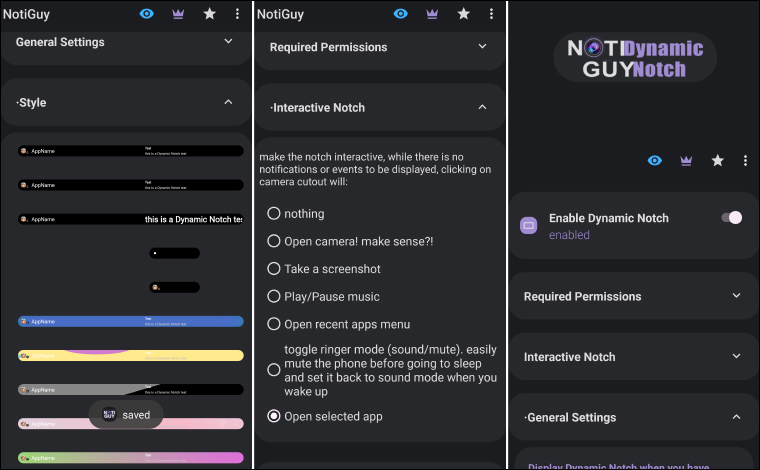 تطبيق مميز جدًا يتيح لك الاستفادة من ثقب الكاميرا (النوتش) الموجود أعلى الشاشة وذلك من خلال جعله تفاعليًا، بالإضافة إلى الاستفادة من شريط الحالة لعرض الإشعارات التفاعلية كما تفعل خاصية Dynamic Island في هواتف آيفون 14. تطبيق NotiGuy يقدم معظم مميزاته بشكل مجاني تمامًا، إلا ان هناك إمكانيات يتطلب فتحها شراء النُسخة المدفوعة، لكن صراحًة التطبيق يستحق كونه يسهل استخدام الهاتف بشكل كبير. ما عليك سوى لمس النوتش لإلتقاط Screenshot أو فتح تطبيق الكاميرا، أو فتح تطبيق محدد أو تشغيل/إيقاف الوسائط، أو تفعيل وضع الصامت، وغيرها من الإجراءات الأخرى التي يمكن تحديدها وتخصيصها من الواجهة الرئيسية للتطبيق. [تحميل التطبيق: Android]