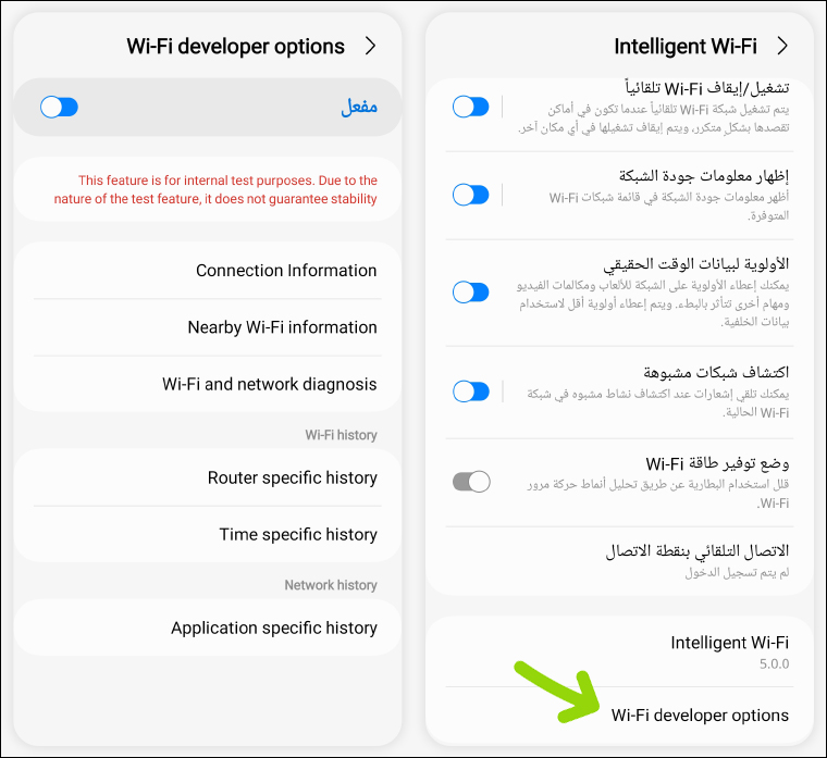 كل المطلوب للكشف عن هذه القائمة هو فتح “الضبط” Settings سواء من قائمة التطبيقات أو لوحة الإعدادات السريعة، ثم الانتقال إلى قسم “الاتصالات” Connections ثم الضغط على “Wi-Fi” من أعلى القائمة. تأكد من أنك متصل بشبكة واي فاي، بعدها اضغط على زر القائمة ( ⁝ ) أعلى اليسار واختر “Intelligent Wi-Fi” لتظهر مجموعة الخيارات التي أشرنا إليها في الفقرة السابقة. والآن لإظهار القائمة السرية قم بالتمرير إلى أسفل واضغط 5 مرات متتالية على الجزء الذي يعرض إصدار Intelligent Wi-Fi حتى تظهر رسالة [You are now a Wi-Fi developer].