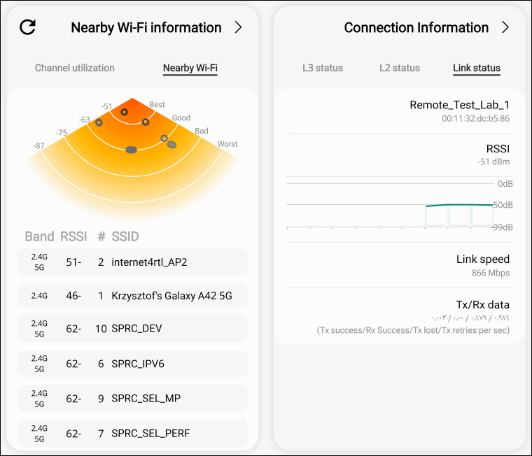 تعرض هذه الخيارات كم هائل من المعلومات الدقيقة حول اتصال الواي فاي، على سبيل المثال، يمكنك من خلال خيار “Connection Information” معرفة مدى استقرار اتصال الهاتف بالراوتر، وسرعة الاتصال، وحجم البيانات المرسلة والمستلمة، إصدار الـ Wi-Fi المستخدم، بروتوكول الواي فاي، وغيرها من البيانات التي لا تظهر عادًة في صفحة إعدادات الشبكة. هناك أيضًا خيار “Nearby Wi-Fi Information” والذي يعرض رسم مرئي حول الشبكات المجاورة الأقرب والأبعد من موضع هاتفك حاليًا بالإضافة إلى قائمة تضم أسماء هذه الشبكات وترددات الاتصال المتاحة لكل منها، كما ستجد في هذا الخيار قسم “Channel utilization” والذي يساعدك على اكتشاف قنوات الواي فاي ذات التغطية القوية لضبط اعدادات الرواتر عليها.