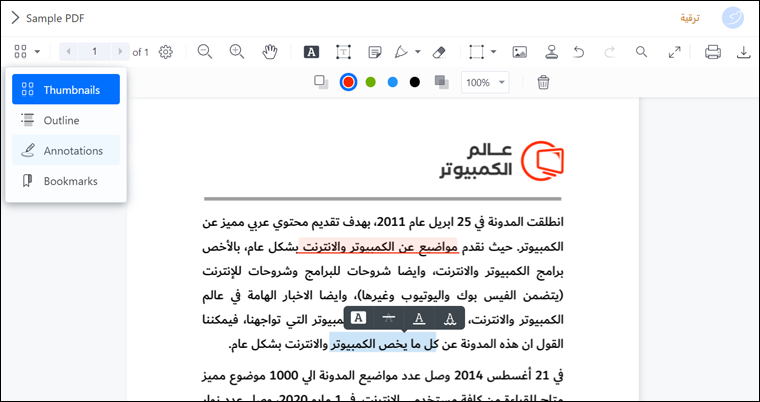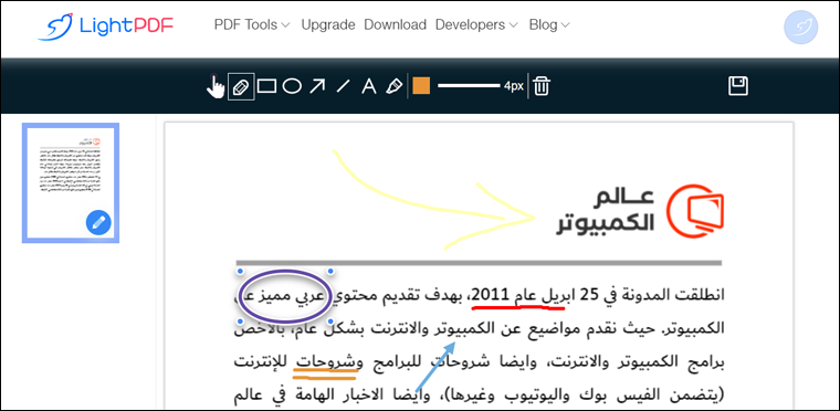 أثناء قراءة كتب أو مستندات PDF، قد تجد شيئًا مهمًا وترغب في وضع علامة عليه بحيث يسهل تمييزه، أو ترغب في إضافة بعض الرسومات التوضيحية في أجزاء معينة حتى تكون واضحة للقارئ. في هذه الحالة يمكنك أيضًا الاعتماد على أداة LightPDF من خلال وظيفة “التعليق على PDF” حيث تستطيع ببساطة إضافة تعليق توضيحي على المحتوى باستخدام أدوات الترميز مثل التسطير، والتمييز، والنص المشطوب، والملاحظات اللاصقة، وغيرها. باستخدام هذه الوظيفة، يمكنك إضافة أشكال أخرى أيضًا مثل مستطيل أو دائرة والأسهم والخطوط المستقيمة، كما يمكن للمستخدم تخصيص النمط والسمك والحدود والألوان ومستوى الشفافية — بمعنى آخر يصبح ملف الـ PDF عبارة عن صورة ولديك الأدوات الأساسية للتعديل عليها كما يحلو لك!
