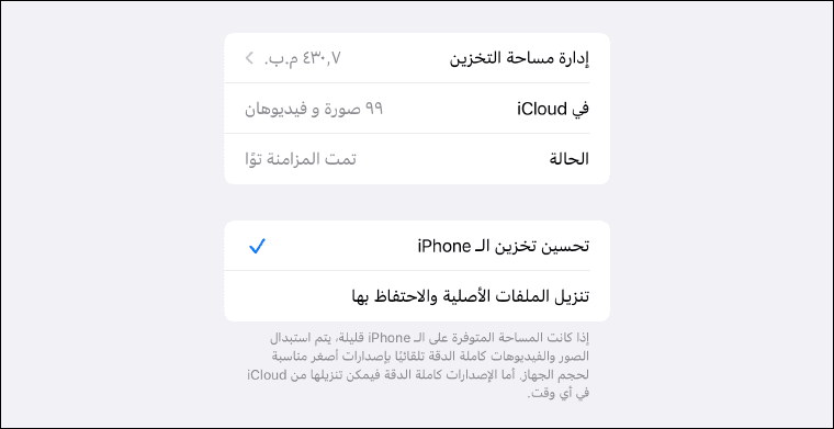 ولكن حتى لو كانت كل الصور مخزنة على iCloud سيظل الهاتف محتفظًا بها على السعة التخزينية الأساسية ولن يتم توفير المساحة المشغولة من قبل الصور. لتوفير المساحة، كل ما عليك هو تحديد خيار “تحسين تخزين الـ iPhone” أو Optimize iPhone Storage.