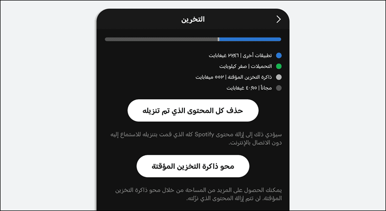 لذلك، يُفضل من حين لآخر التخلص من هذه البيانات المؤقتة وتفريغ ذاكرة الكاش لتوفير مساحة، وهذا الأمر لا يتطلب حذف وإعادة تثبيت التطبيق كما هو الحال مع وغيره، بل يمكن تفريغ الذاكرة من التطبيق نفسه. فمثلًا في تطبيق “سبوتيفاي” بعد تشغيله اذهب إلى قائمة الخيارات ثم إلى “الإعدادات” وحدد “التخزين” لتجد زر “نحو ذاكرة التخزين المؤقتة” فأضغط عليه. وفي تطبيق “تيليجرام” بعد تشغيله اذهب إلى علامة تبويب “إعدادات” ثم انتقل إلى قسم “التخزين والبيانات” واضغط على “استخدام التخزين” وعند التمرير إلى أسفل ستظهر أمامك المساحة المشغولة من قبل الذاكرة المؤقتة. لتحرير هذه المساحة، اضغط على “مسح ذاكرة تيليجرام المؤقتة” وسيتم حذف البيانات المؤقتة فورًا.