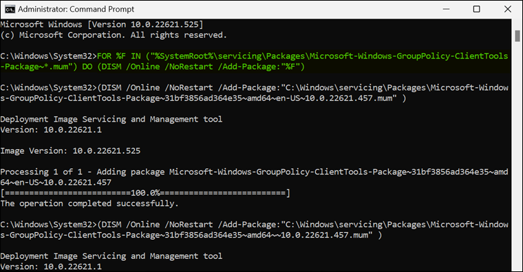 FOR %F IN (“%SystemRoot%servicingPackagesMicrosoft-Windows-GroupPolicy-ClientTools-Package~*.mum”) DO (DISM /Online /NoRestart /Add-Package:”%F”)